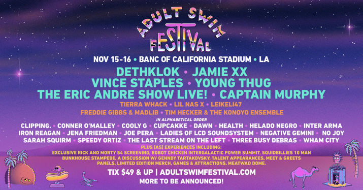 The Adult Swim Festival just got bigger! The super-sized two-day event is happening on Friday, November 15 and Saturday, November 16, at Los Angeles’ newest entertainment venue, Banc Of California Stadium. This year’s line-up features top bands and musical artists, comedians and immersive fan experiences that only Adult Swim can bring to life.