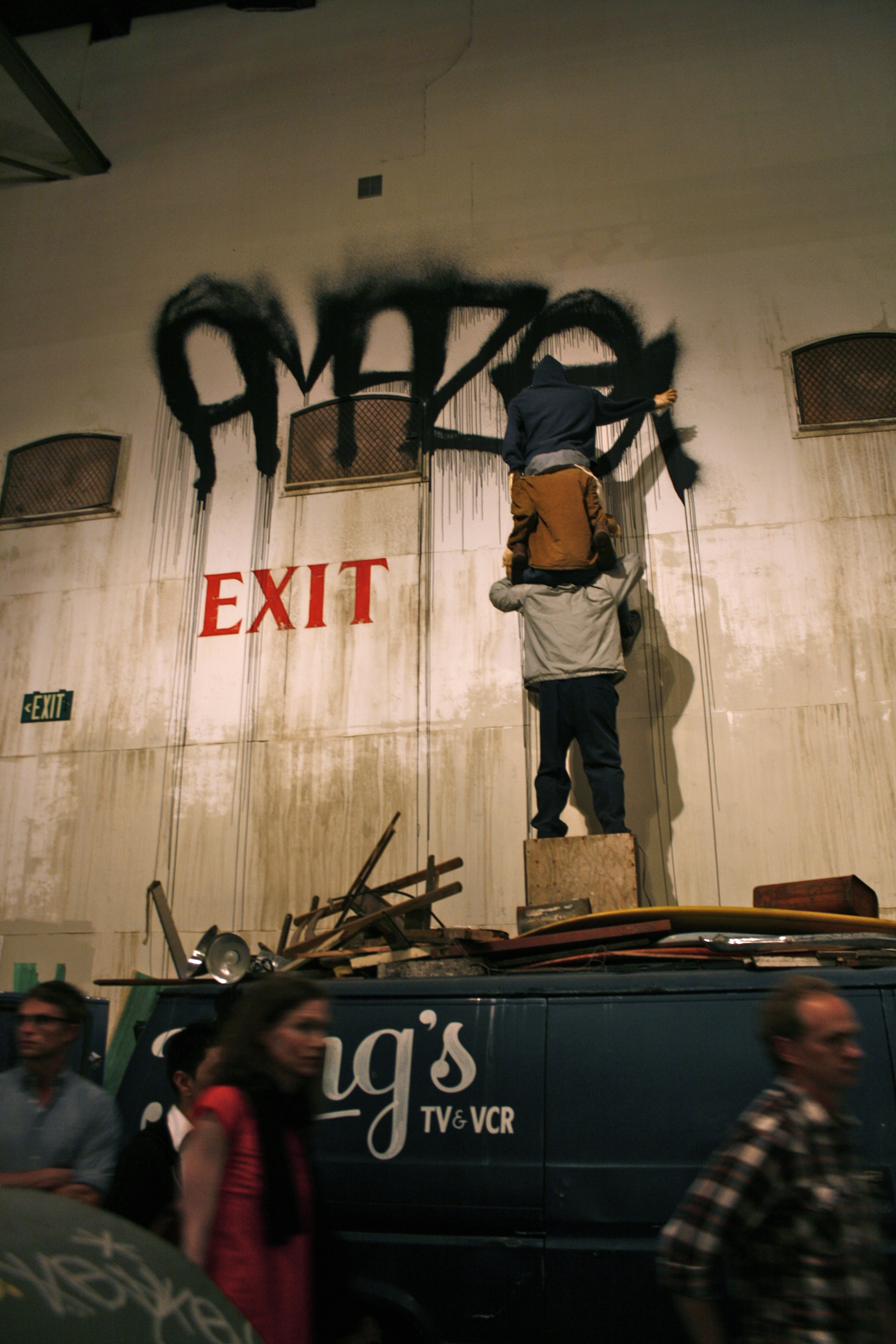 Twist has put together one of my favorite installations, complete with three robotic graffiti artists up on each other’s shoulders, standing on a van, hitting up a wall.