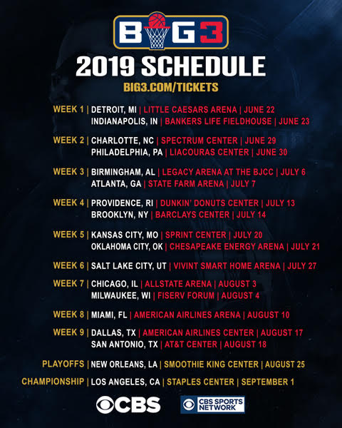 BIG3 – the professional 3-on-3 basketball league founded by producer, actor, and music legend Ice Cube and entertainment executive Jeff Kwatinetz – announced additional dates to round out the league’s 11 week season across 18 cities: Salt Lake City July 27, Milwaukee August 4, Miami August 10, and New Orleans for the playoffs August 25.