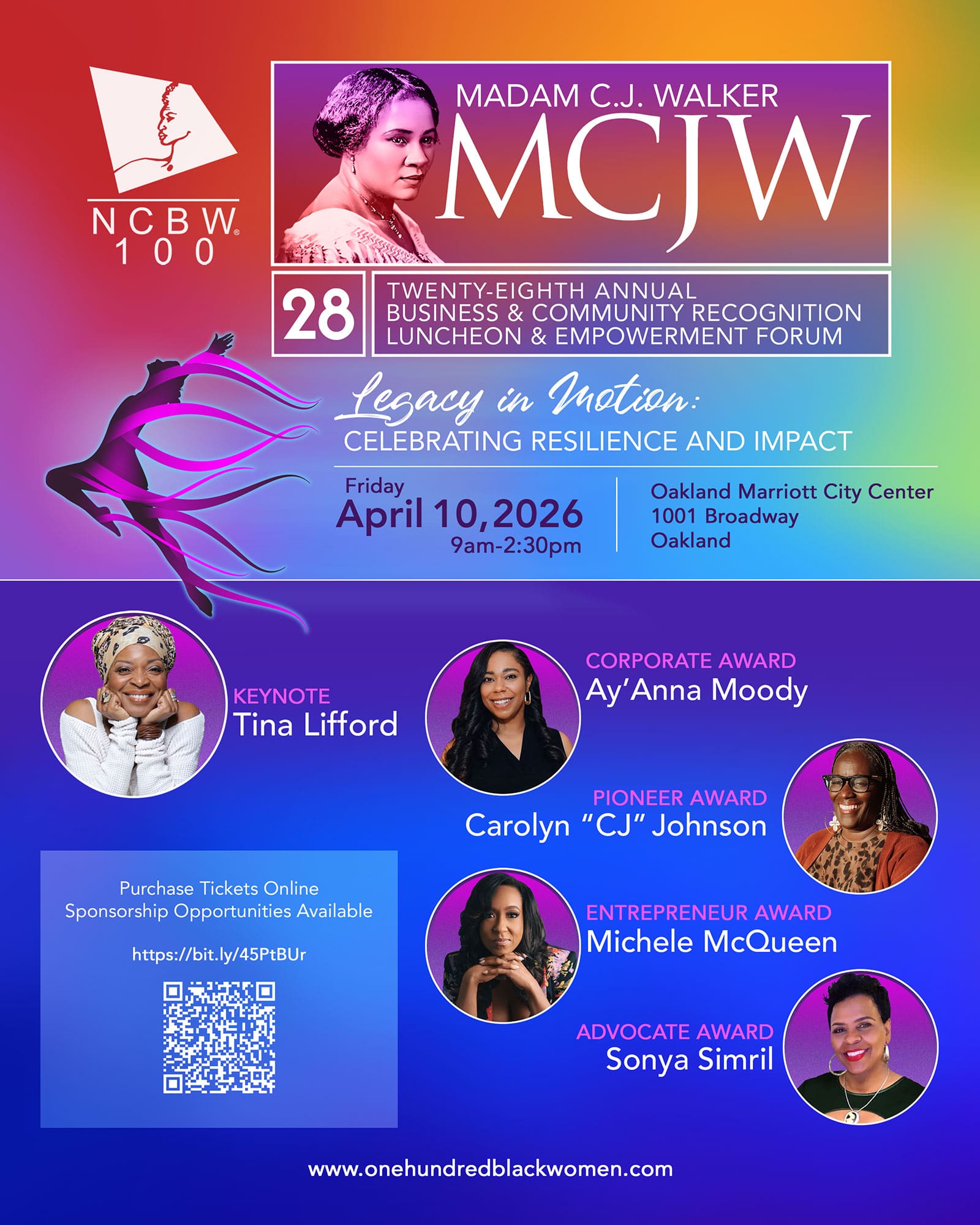 The National Coalition of 100 Black Women, Inc. Oakland Bay Area Chapter honors Madam C.J. Walker’s legacy by recognizing Black women in the community for their outstanding accomplishments. The proceeds from our annual luncheon and empowerment forum enables our chapter to continue to provide programs in our key initiatives of health, education, and economic empowerment. This premier event attracts 850 – 1000 women and men from all over the San Francisco Bay Area. Our 28th Annual Madam C.J. Walker Luncheon & Empowerment Forum will be taking place on April 10, 2026 at the Oakland Marriott City Center.