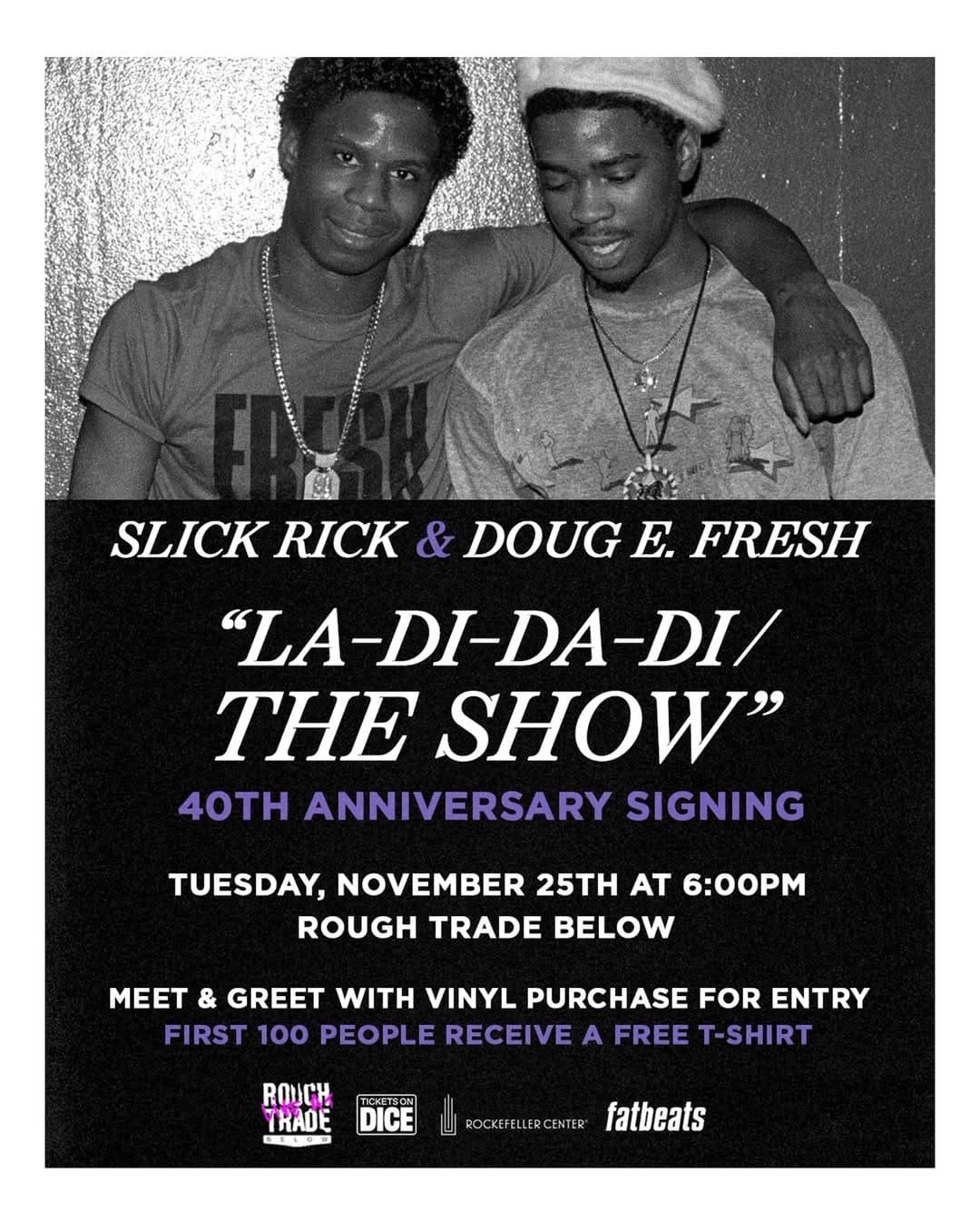 Doug E. Fresh & Slick Rick will be appearing in person at Rough Trade Below, on Tuesday, November 25th at 6pm, for a signing celebrating the 40th anniversary of their iconic 12″ single La-Di-Da-Di / The Show.