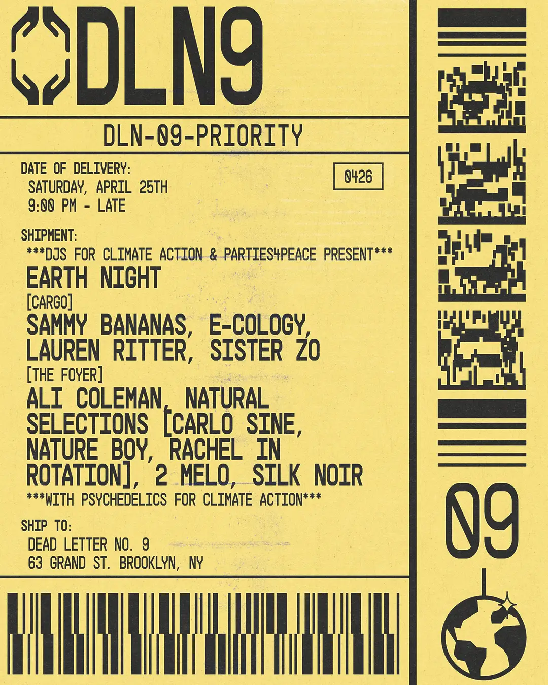 On Saturday, April 25th Dead Letter No.9 links with Parties4Peace and DJs for Climate Action for a global initiative turning nightlife into impact where dance floors double as spaces for connection, awareness, and action. Join us for Earth Night, part of a global series uniting communities across cities to celebrate, raise funds, and move climate action forward through music and culture.