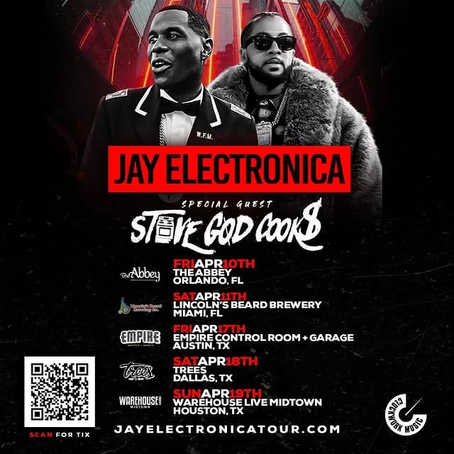 Known for his mystique, cerebral lyricism, and spiritually charged performances, Jay Electronica will bring his powerful live presence to intimate venues across the U.S. and Canada, offering fans a unique opportunity to experience his music in a raw, immersive setting. The tour reflects a deliberate and purposeful journey—true to his artistry—connecting deeply with audiences city by city.