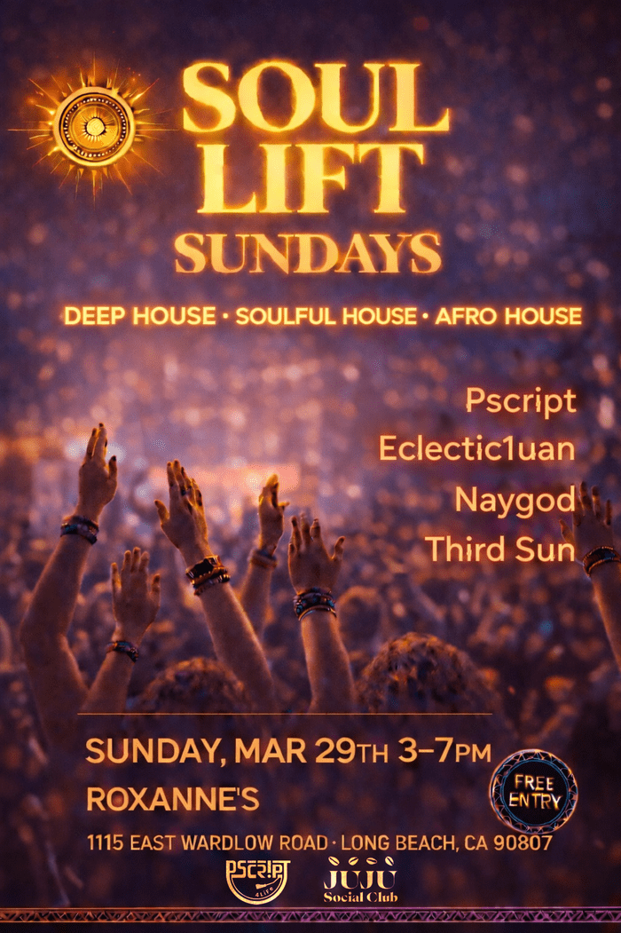 Lock into a soul lifting journey with PScript, Eclectic1uan, Naygod, and Juju SC’s own Third Sun bringing that deep, eclectic, feel good energy all day into the evening 🎶🔥
