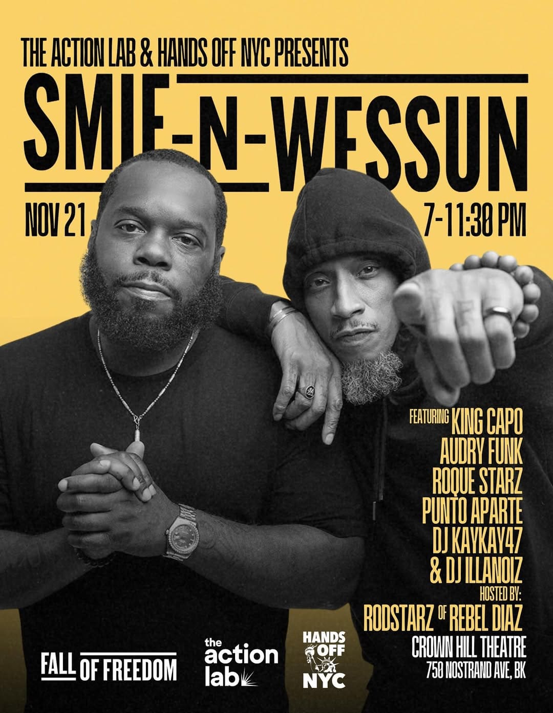 The legendary Smif n Wessun of “Bucktown” and Boot Camp Click fame headlines this powerful show as a crew reppin Brooklyn, we have King Capo from the Dominican Republic, Audry Funk repping the immigrant experience in NY via Mexico, we have the young Roque Starz literally repping for the kids and the youth whose future is at stake. Along with RodStarz and DJ Illanoiz from Rebel Diaz and DJ KayKay47 repoin for the ladies from The Bronx. Presented by The Action Lab and Hands Off NYC.