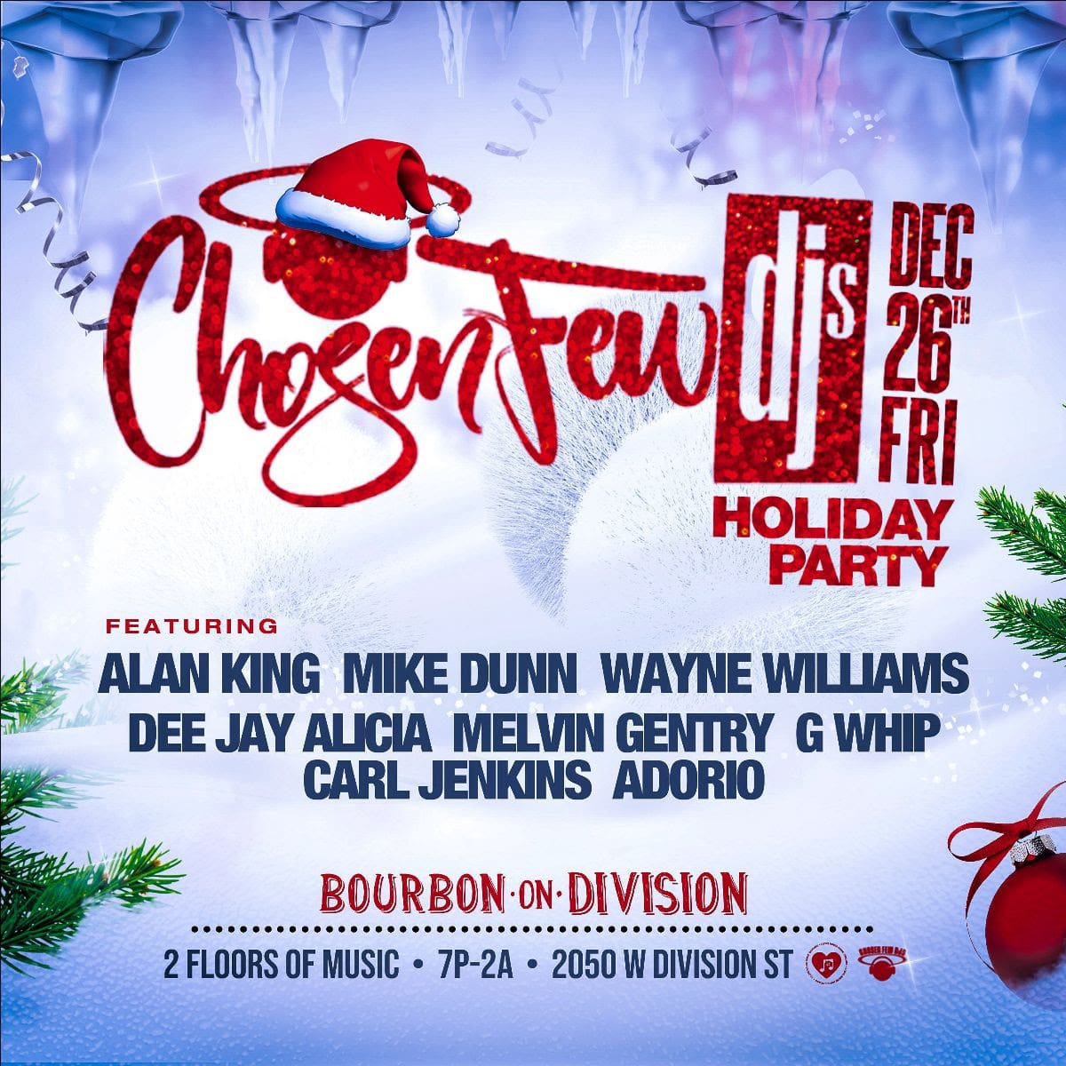 You are cordially invited to join us for The Chosen Few Djs holiday party. Alan King, Mike Dunn, Wayne Williams Dj with Dee Jay Alicia, Melvin Gentry, G Whip, Adorio and Carl Jenkins on 2 floors from 7pm-2am as they Dj on a Funktion One Sound System.
