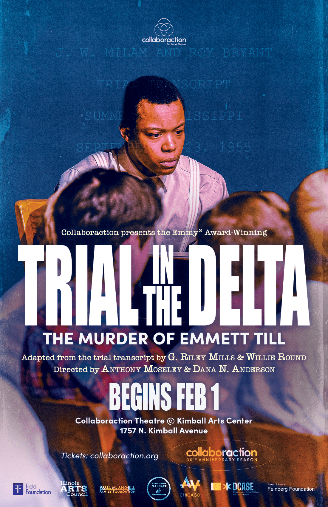 Born from a groundbreaking collaboration with NBC5 Chicago, Trial in the Delta won a National Emmy Award for Outstanding Documentary, two Chicago/Midwest Emmy Awards and a Silver Gavel Award from the American Bar Association. Collaboraction grew the teleplay into a full-length, immersive theatrical experience that had two short runs at the DuSable Black History Museum. The final live performance in February 2023 was professionally filmed and has been screened for groups including the The Emmett Till and Mamie Till-Mobley Institute, the Chicago History Museum, the Chicago Chapter of the Federal Bar Association and the First Circuit Court of Philadelphia.