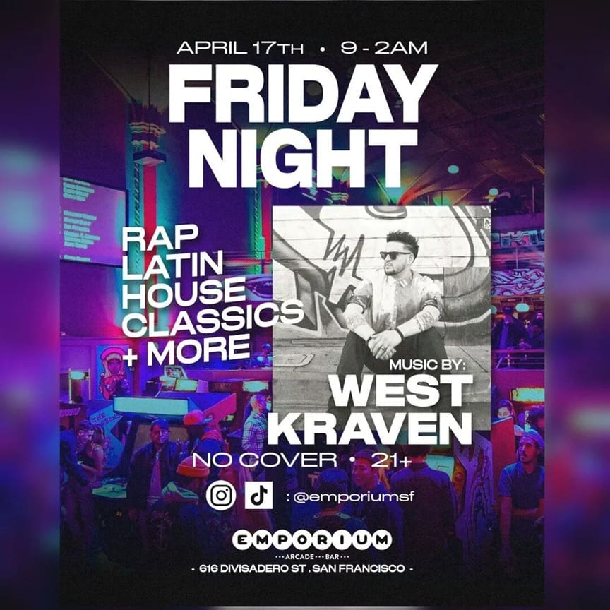 West Kraven sets the stage at Emporium Arcade Bar for the ultimate night out. Enjoy handcrafted drinks, arcade games, and fun all night long! No cover charge, 21+