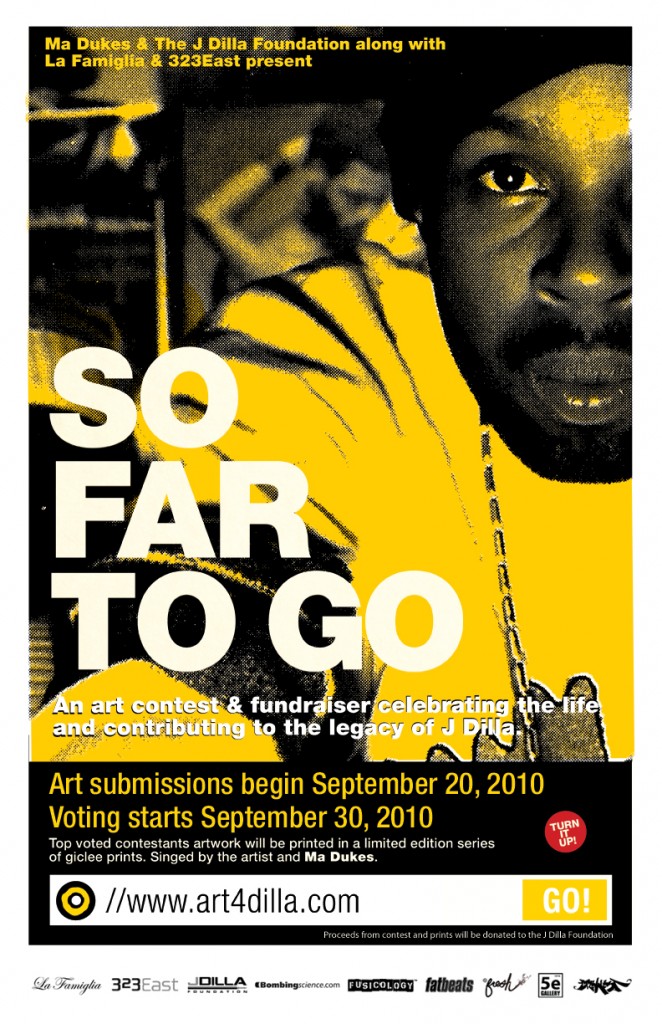 The “So Far To Go” International J Dilla Art Contest is organized by La Famiglia Magazine and 323East Gallery on the behalf of Ma Dukes and the J Dilla Foundation. Sponsors include Fat Beats, Fusicology, Crewest, 5e Gallery, RX Fresh, Ironlak, Bombing Science and Ohm Creative Group.
