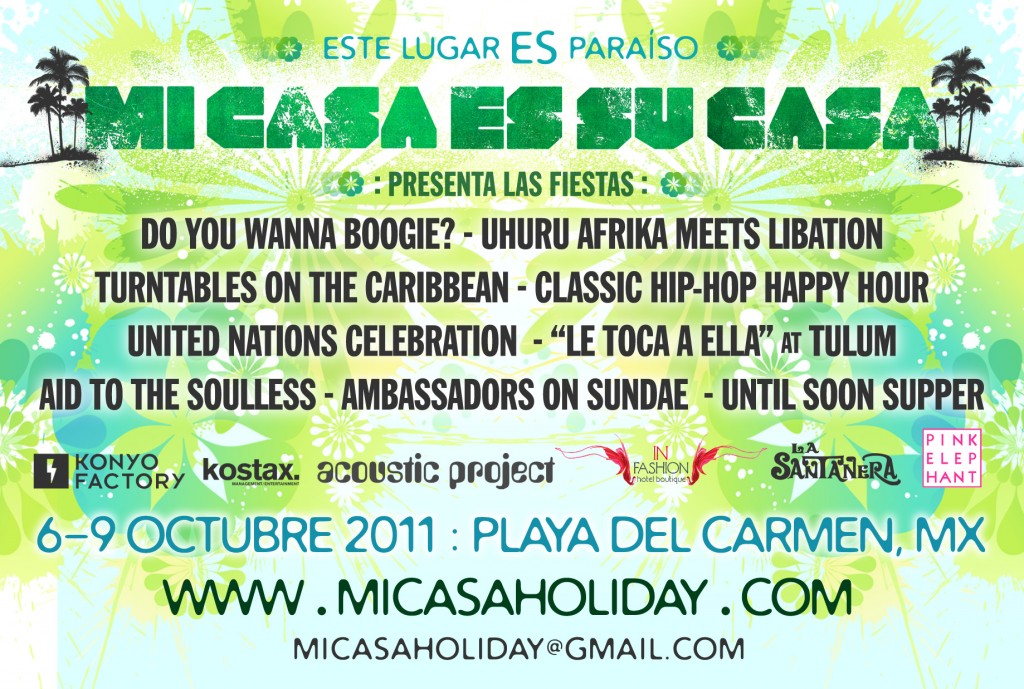 If you haven’t heard already, join music enthusiasts from across the world for the Mi Casa Es Su Casa Holiday Finale! Launching at WMC(Winter Music Conference) 2011, Mi Casa Holiday has been jet-setting around the globe hosting a series of uniquely tailored events all leading to an incredible ending October 6-9th in Playa del Carmen, Mexico. Imagine an engaging, unforgettable weekend hosting 9 unique social events spanning 4 energetic days featuring an eclectic mix of over 30 Global DJs / Artists from Latin America, United States, France, UK, and beyond. Now envision pristine beaches, luxurious hotel accommodations coupled with enthusiastic people and amazing food.