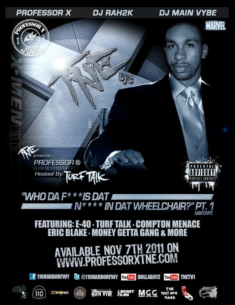For more information about Professor X and his music, visit http://www.ProfessorXTNE.com ,follow him on Twitter @110harborfwy and friend him on Facebook under 110Harborfwy. “Who Da F*** Is Dat N**** In Dat Wheelchair” Mixtape Pt.1″ is available online on ITunes.