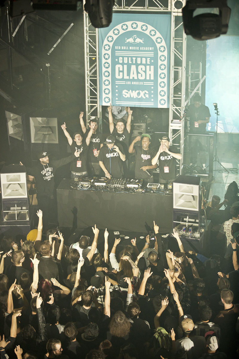 Los Angeles, CA- December 6, 2012 – Last night, Red Bull Music Academy Culture Clash returned to Los Angeles, bringing four internationally respected collectives to compete under one roof at Exchange LA. The collectives—Smog and Dim Mak, both of whom competed in 2010, and newcomers Friends of Friends and Jeffree’s—battled in a series of four rounds to be named winner by a show of applause from the 1200 people in attendance. Each collective brought huge crowds and dedicated fans, but at the end of the night it was Smog and Friends of Friends who were neck-in-neck on the leaderboard. After a final round of voting to see which of the two had the most crowd support, Smog was named the winner and treated the enthusiastic crowd to a victory set.