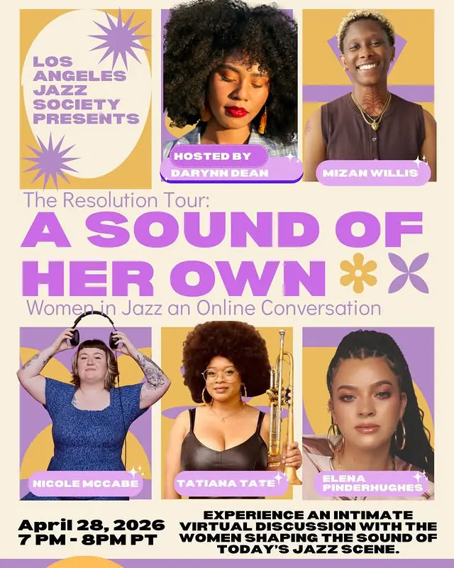 A live panel hosted by jazz vocalist Darynn Dean, explores how women in jazz are shaping the sounds of today. Featuring the extraordinary flutist, vocalist, and composer Elena Pinderhughes, dynamic saxophonist and composer Nicole McCabe, powerful West African percussionist and recording artist Mizan Willis, and the soulful trumpeter, composer, and bandleader Tatiana Tate. Together we will explore how jazz continues to evolve and how inclusion, identity, and innovation are reflected in the music.